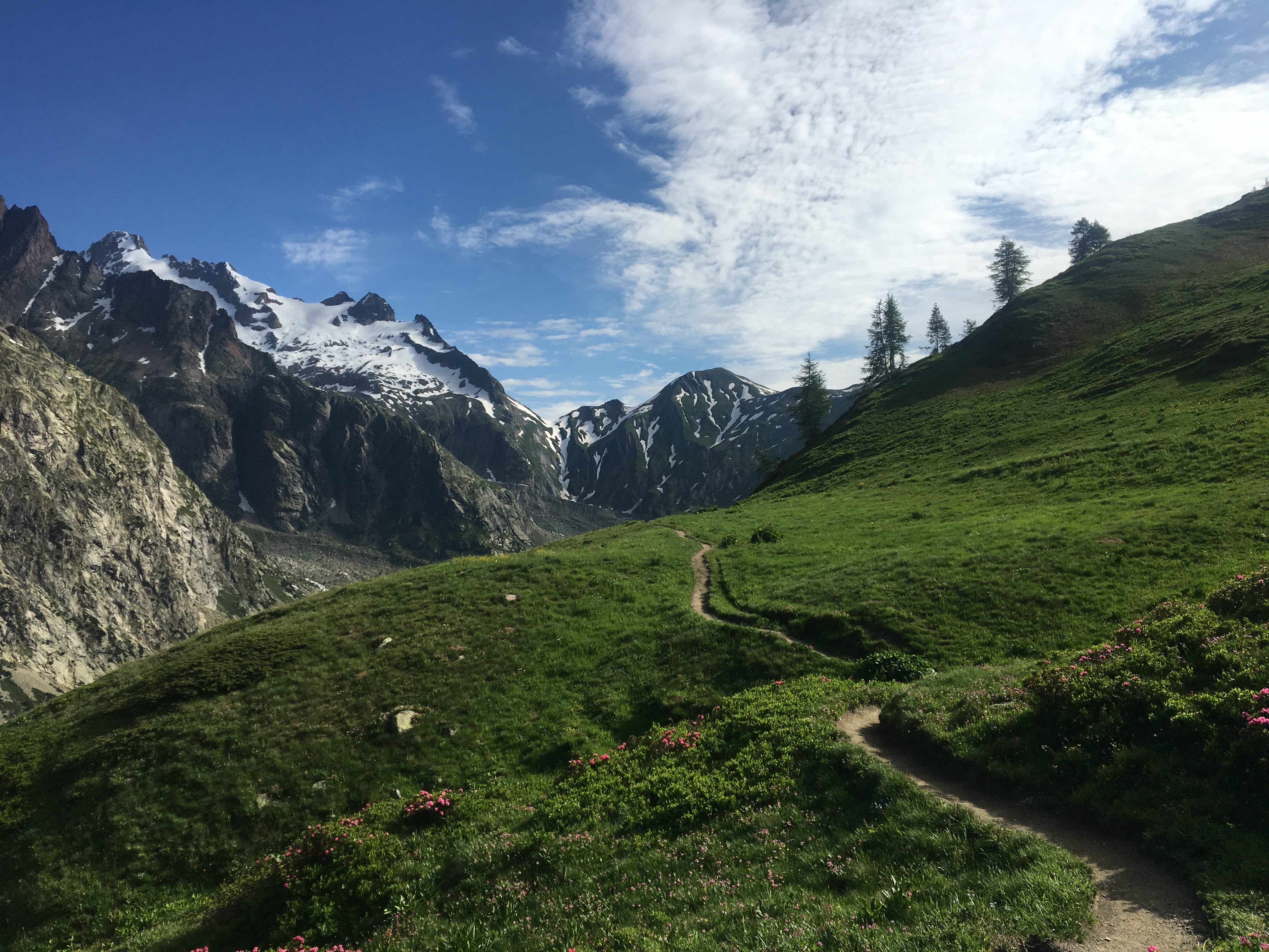I began the day with an additional ascent compared to those that stayed at Bonatti, because I had to hike back up the valley floor from Hotel Lavachey in order to start the hike at Bonatti. Most of the people at my hotel took the bus to Chalet Val Ferret to skip an unnecessary ascent and descent, but I decided I would rather do the full thing. I was pretty happy with that decision, especially due to the total solitude it afforded me in the beginning of the day!