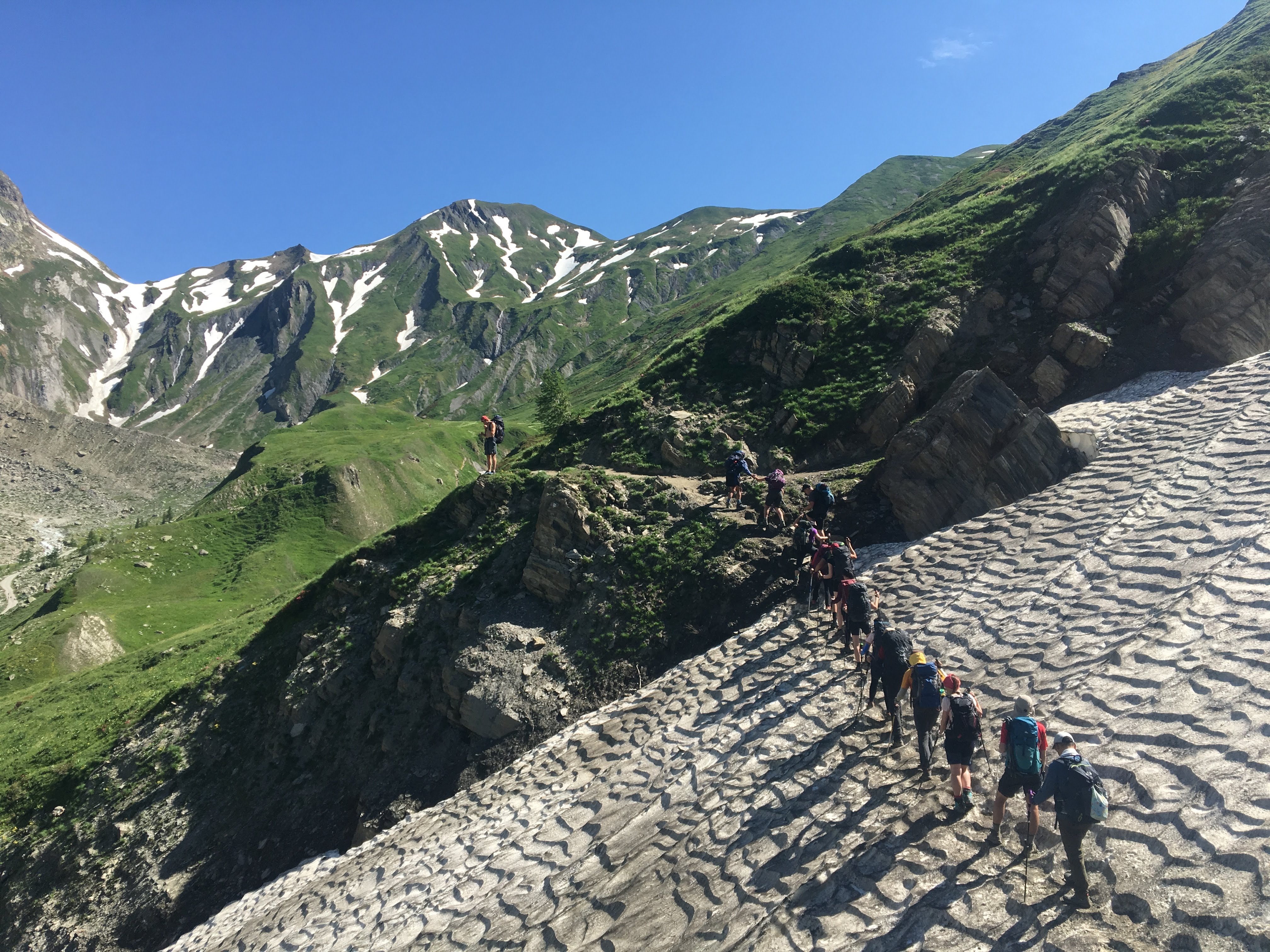 The ascent down was much less crowded, probably because everyone had spread out. Some snowfield crossings were required but by this time in the trip that’s an old hat for everyone. I got lunch at Alpage de la Peule, an old dairy farm. By the time I made it to Hotel Col du Fenêtre, I was quite ready to have a beer in their nice beer garden!