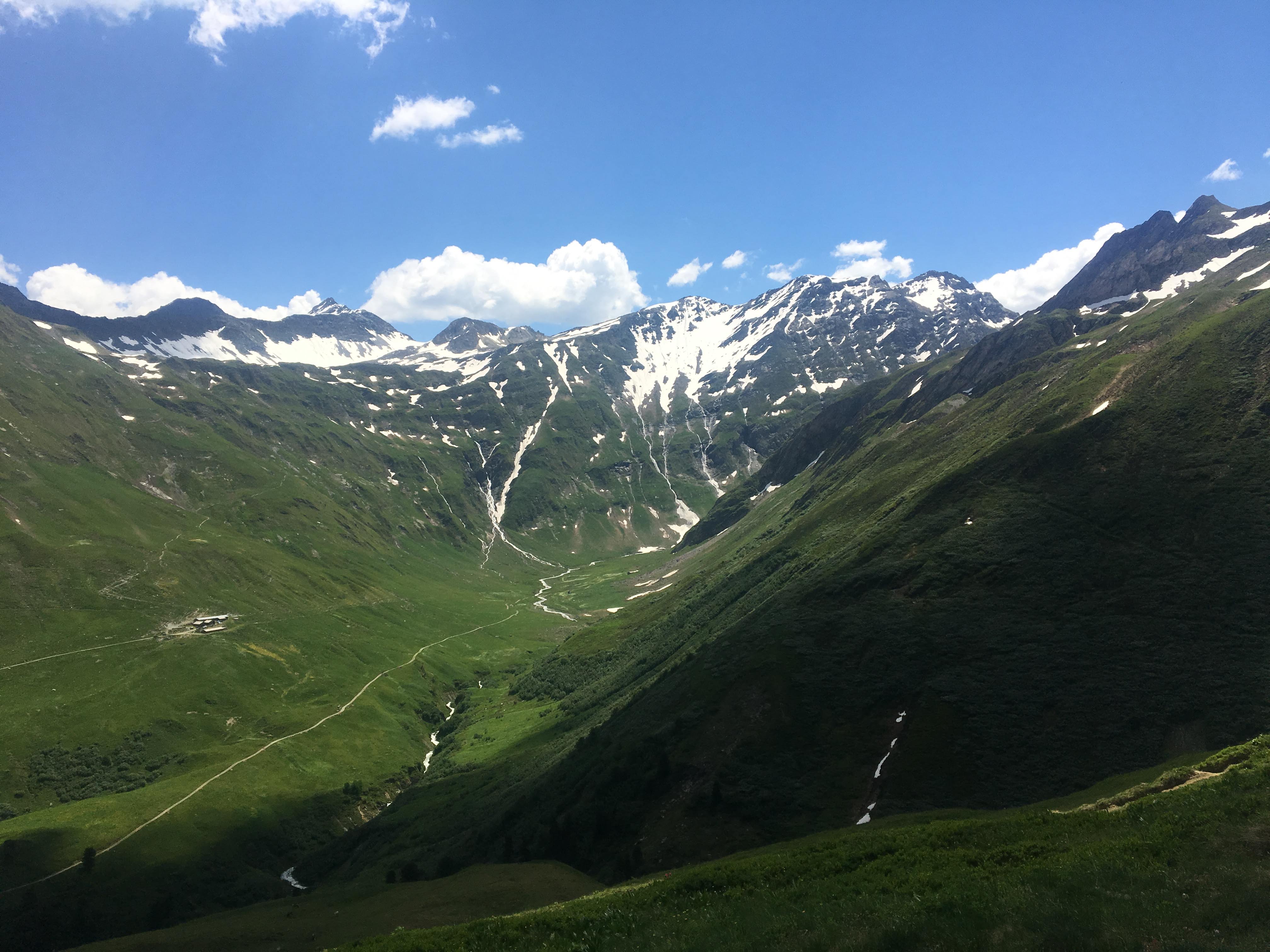 At the top of the Col Ferret (quite a slog, and fairly crowded compared to other days — maybe due to the lack of a variant) you say goodbye temporarily to the dramatic mountain scenery of the Italian range and hello to the valleys of Switzerland.
